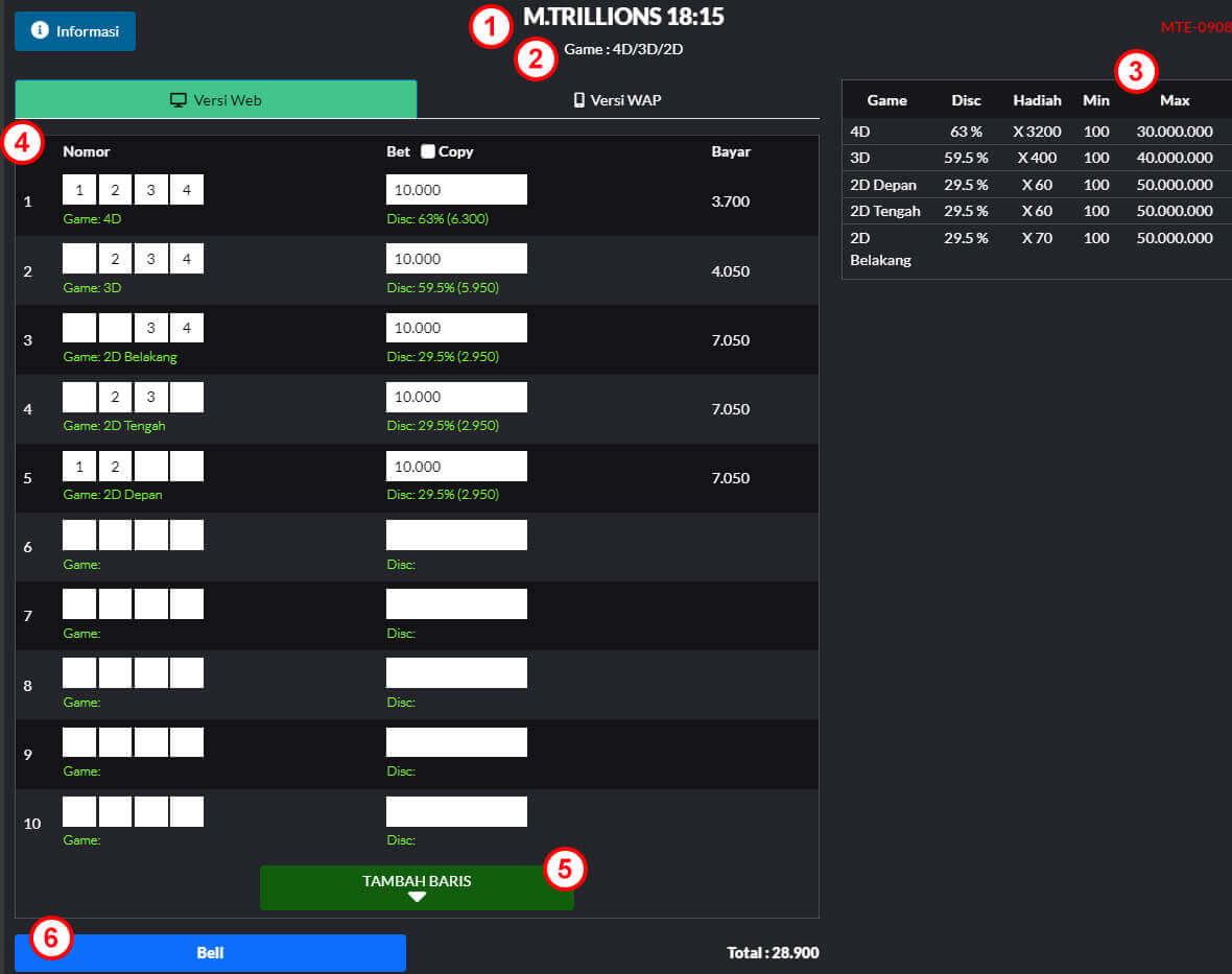 Tombol Tambah Baris berfungsi untuk menambah jumlah line apabila member ingin bertaruh lebih banyak line